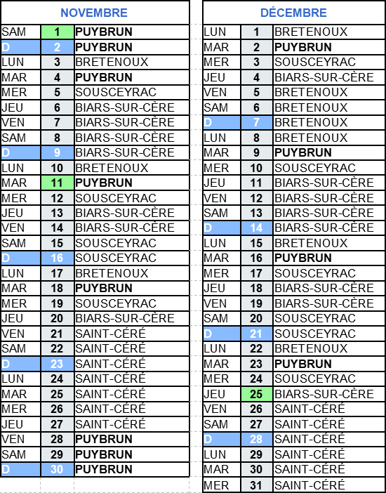 - Samedi : 8h - 12h 1 samedi par mois à PUYBRUN